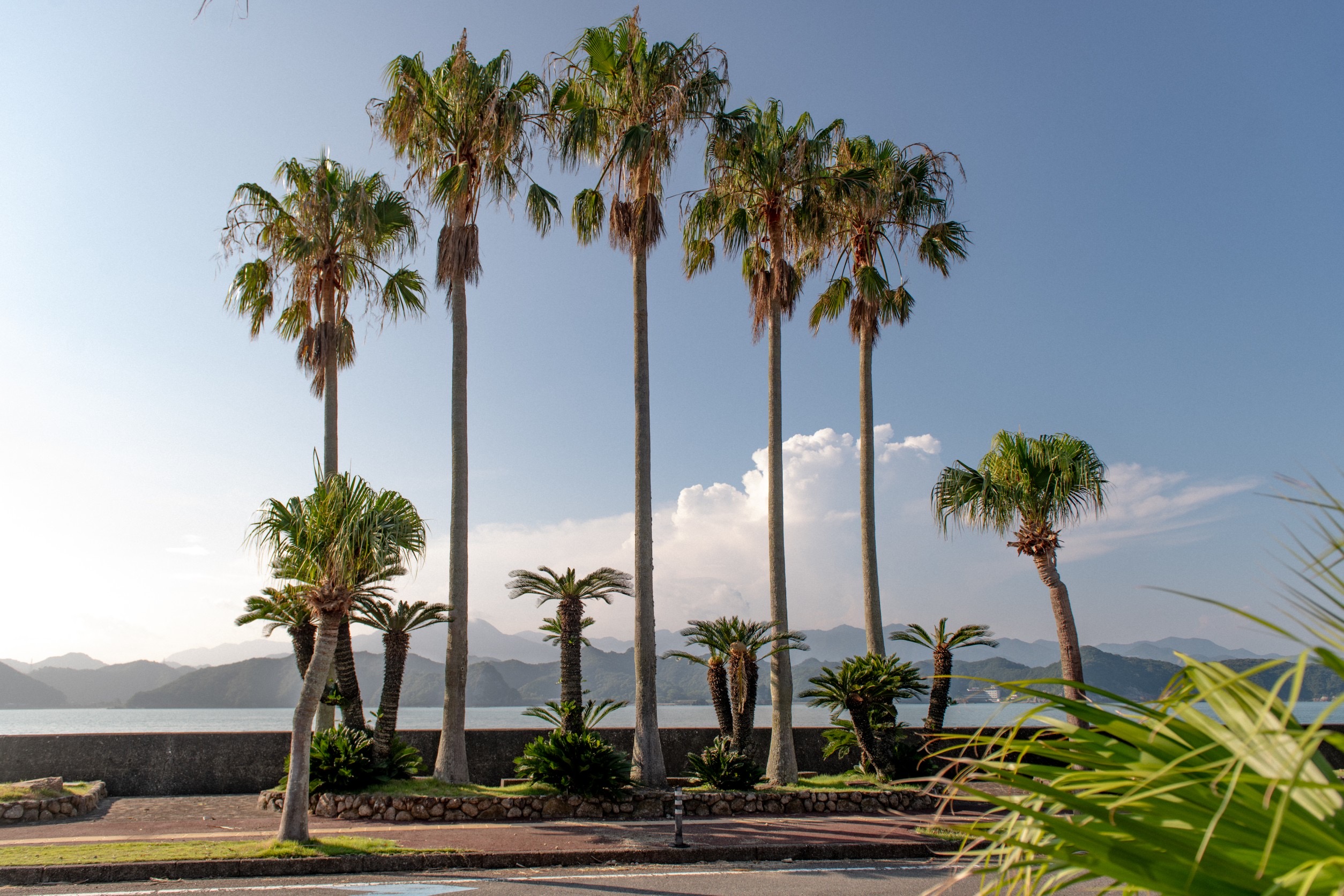 海沿いに立ち並ぶヤシの木とエメラルドグリーンの海は